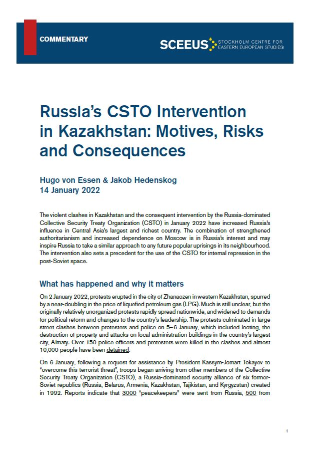 The violent clashes in Kazakhstan and the consequent intervention by the Russia-dominated Collective Security Treaty Organization (CSTO) in January 2022 have increased Russia’s influence in Central Asia’s largest and richest country. The combination of strengthened authoritarianism and increased dependence on Moscow is in Russia’s interest and may inspire Russia to take a similar approach to any future popular uprisings in its neighbourhood. The intervention also sets a precedent for the use of the CSTO for internal repression in the post-Soviet space.