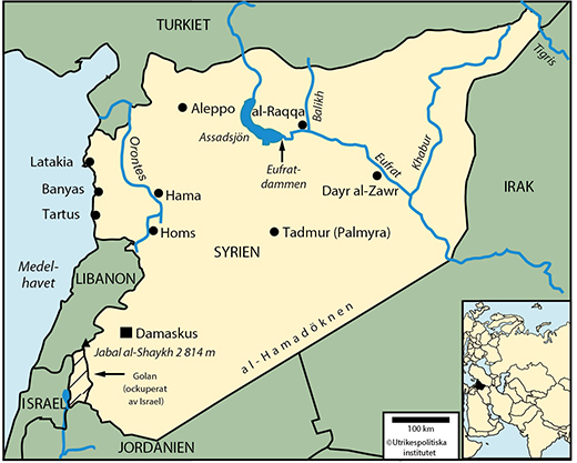 Syrien, vars gränser stakats ut av tidigare kolonialmakter, ligger i östra Medelhavsområdet och domineras av öken, stäpp och berg. Längst i väster har ganska god nederbörd skapat bördiga jordar, medan möjligheten att bedriva jordbruk i de ökenartade områdena i öster är helt beroende av vattnet från floden Eufrat. Till ytan är Syrien något större än Götaland och Svealand tillsammans.