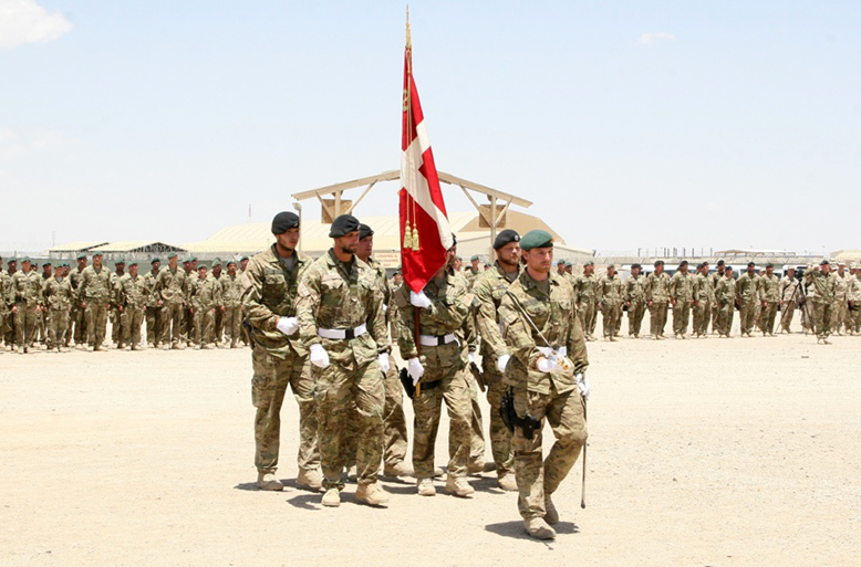 Den danska styrkan på Camp Bastion i södra Afghanistan avslutar sin närvaro i maj 2014 med en ceremoni. Foto: Jessica Ostroska/US Department of Defence