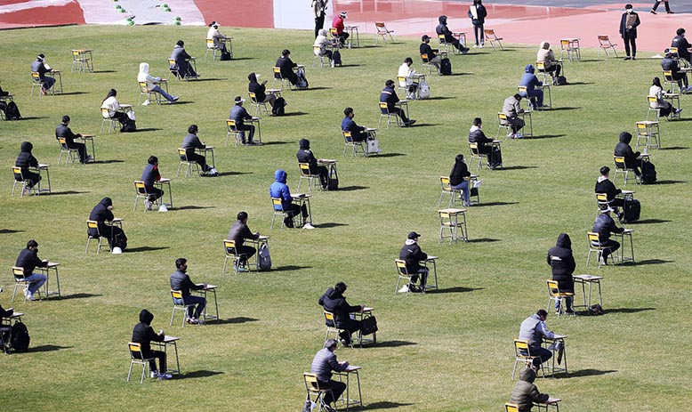 Social distans iakttas när arbetssökande gör tester för anställning på ett företag i staden Ansan. Foto: Ahn Young-Joon/AP/TT