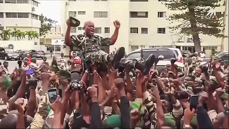TV-bilder på kuppledaren och sedermera interimspresidenten general Brice Clothaire Oligui Nguema som bärs fram i samband med kuppen i Gabon den 30 augusti 2023. Foto: Gabon24 via AP/TT