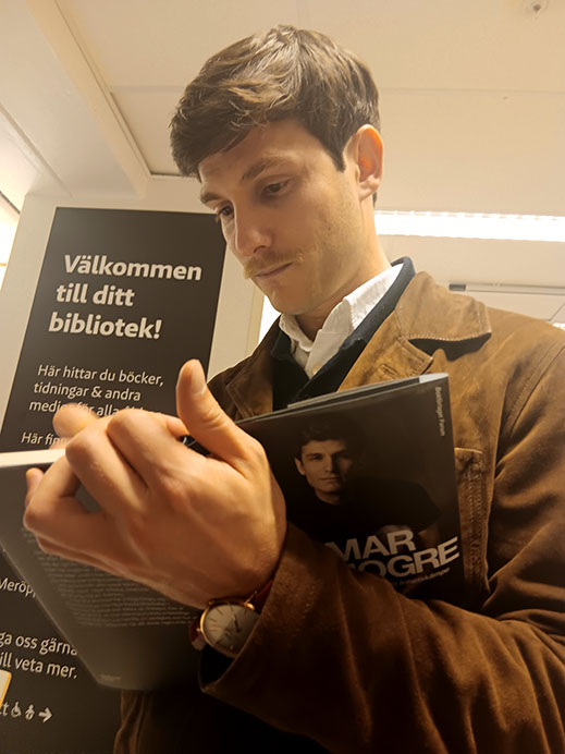 Van föreläsare. Omar Alshogre signerar sin bok vid ett författarsamtal utanför Stockholm.