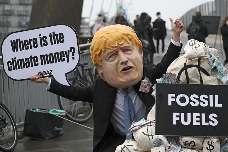 Finansieringsfrågorna är inte nya men har fått förnyad aktualitet. Protest i samband med COP26 i Glasgow i fjol då Storbritanniens premiärminister hette Boris Johnson. Foto: Scott Heppell/AP/TT